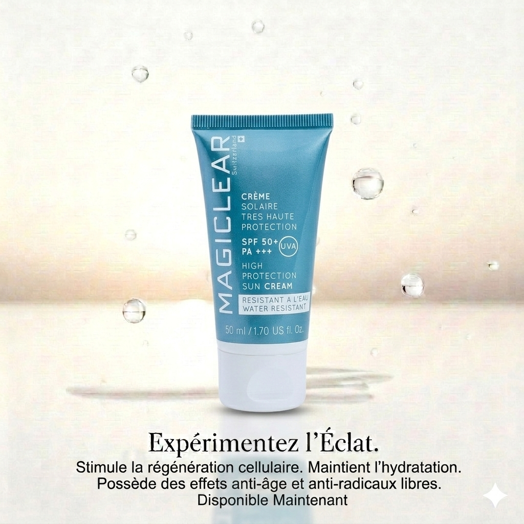 MAGICLEAR – Crème Solaire SPF 50+ est résistante à l'eau et assure une protection optimale de la peau.